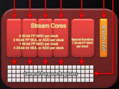Каждый потоковый процессор содержит четыре исполнительных блока и один блок специальной функциональности, а также блок ветвлений и блок регистров общего назначения. В общем, это то же самое, что и у RV770.