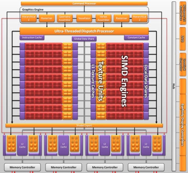 Все улучшения в текстурировании имели бы мало смысла без соответствующей поддержки со стороны системы кэширования. По данным AMD, пропускная способность кэша первого уровня увеличилась до 1 терабайта в секунду (480 ГБ/с у RV770), а пропускная способность между L1 и L2 стала равна 435 ГБ/с (против 384 ГБ/с у предыдущих чипов).