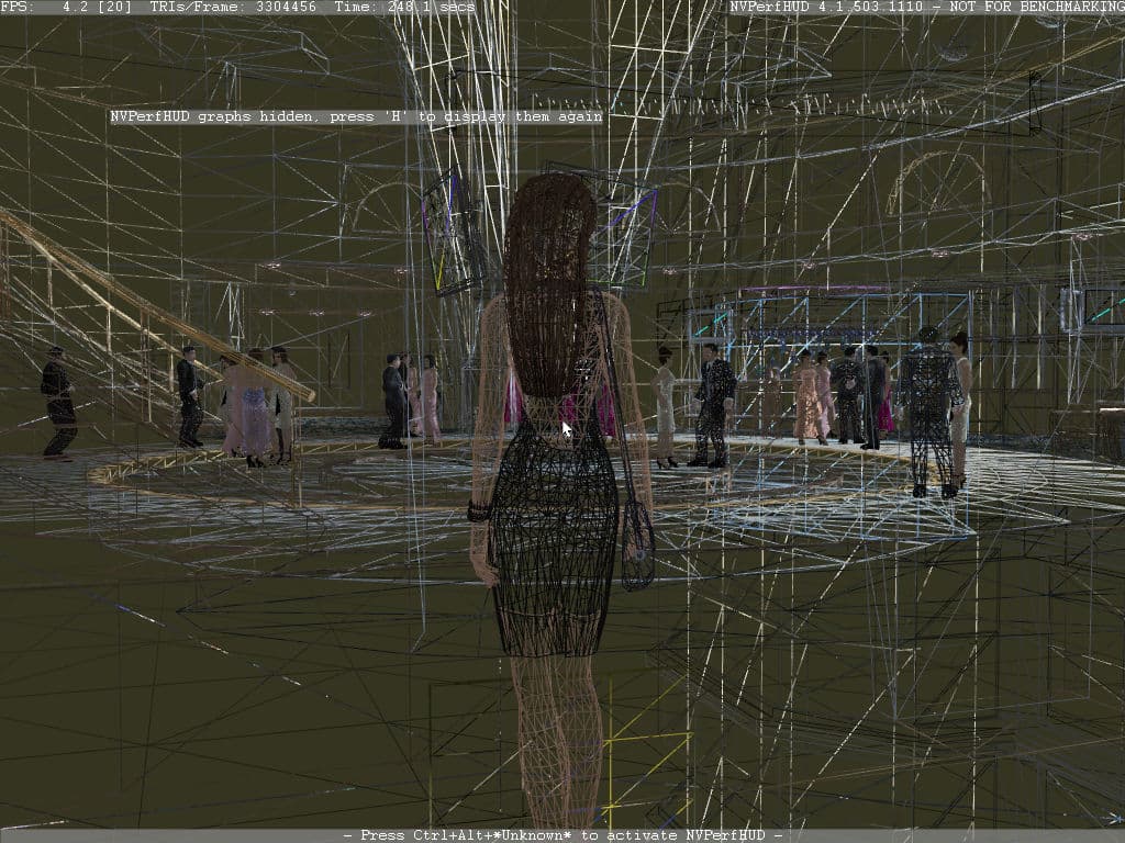 Нам удалось определить некоторые из проблем, вызывающих столь жуткие тормоза в режиме «Next generation content». Tomb Raider: Legend позволяет выбрать видеоадаптер из числа установленных, а при помощи соответствующего ключа в реестре можно выбрать референсный растеризатор DX SDK. Эти две возможности дали провести анализ производительности приложения в NVPerfHUD из набора NVPerfKit 2 без ведома разработчиков. Итак, что удалось обнаружить… Во-первых, похоже, что в игре абсолютно не используются алгоритмы уровня детализации (LOD), что вызывает излишне большую нагрузку на все части конвейера, а особенно на установку вершин и расчеты вершинных шейдеров, так как рассчитывается куча геометрии, которую игрок даже не увидит. Во-вторых, не решен вопрос рендеринга только видимой геометрии, не используется определение видимости объектов, нет никаких оптимизаций по отсечению невидимой геометрии, порой рисуются настолько далекие и невидимые объекты, что просто диву даешься. Чтобы не быть голословным, приведу два скриншота с одного места, в обычном режиме и в wireframe: