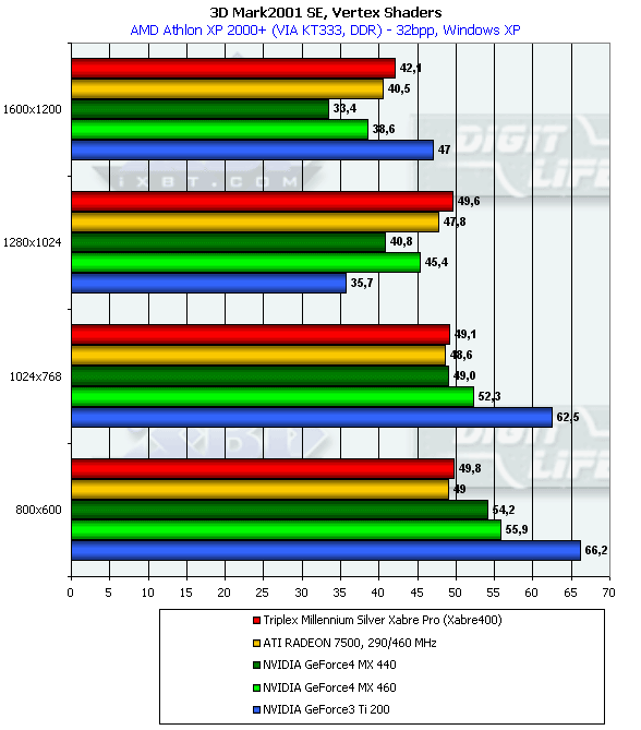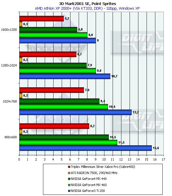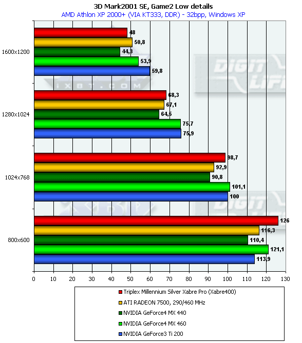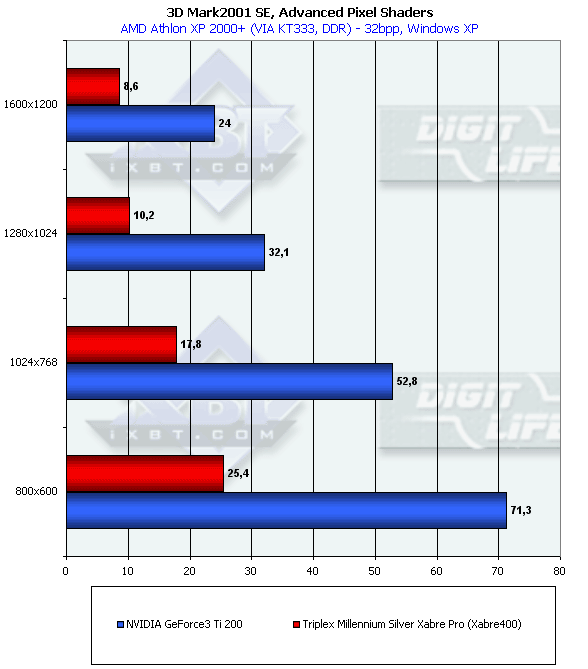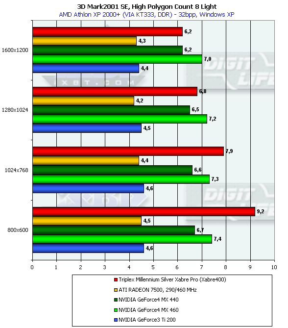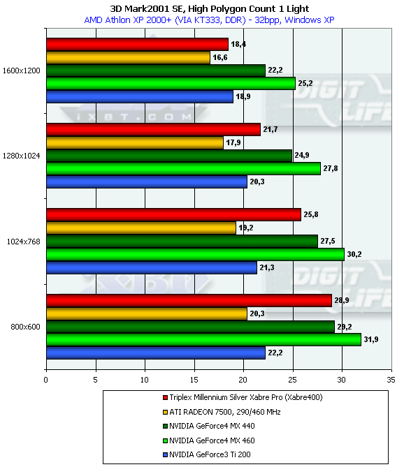 T&L блок Xabre 400 успешно опережает RADEON, но отстает от передовой в этом вопросе NV17. Последняя лидирует благодаря высокой частоте ядра. Благодаря этой же частоте ядра (но на сей раз низкой) GeForce3 Ti200 проигрывает в этом тесте, находясь где-то наравне с RADEON 7500, основная причина неуспеха которого лежит в иной области архитектурном несовершенстве T&L блока.
