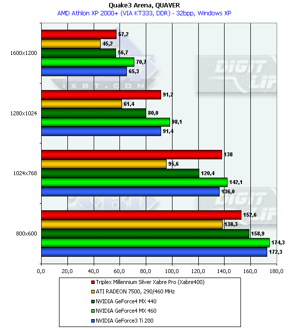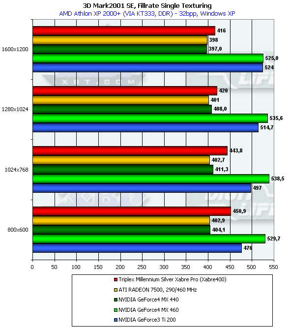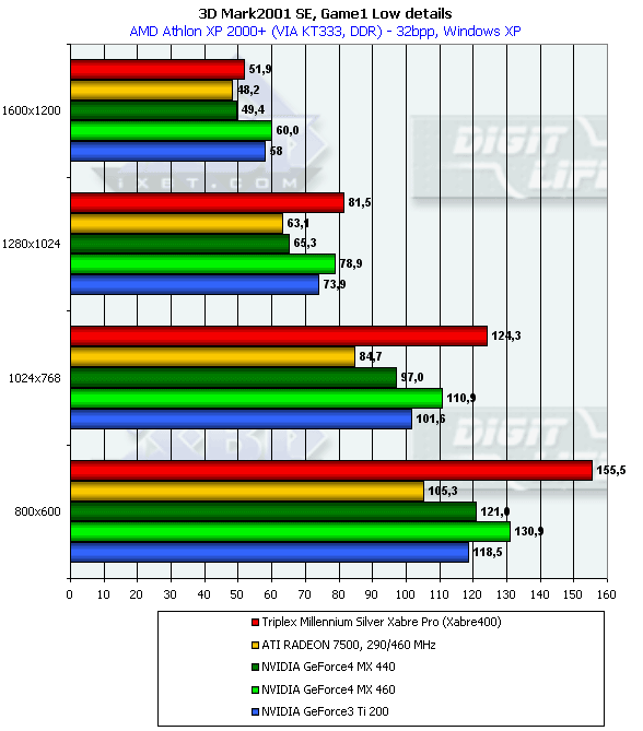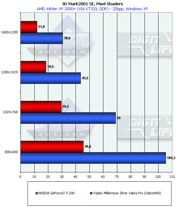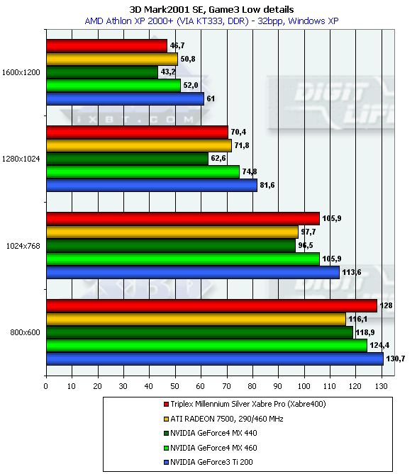 Можно сказать, что, в среднем, Xabre400 занимает уровень между GeForce4 MX 460 и GeForce3 Ti 200, в низких разрешениях обгоняя первую, а в 1600х1200 уже чуть отставая. В популярном разрешении 1024х768 Xabre400 и GeForce3 Ti 200 почти равны.