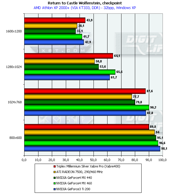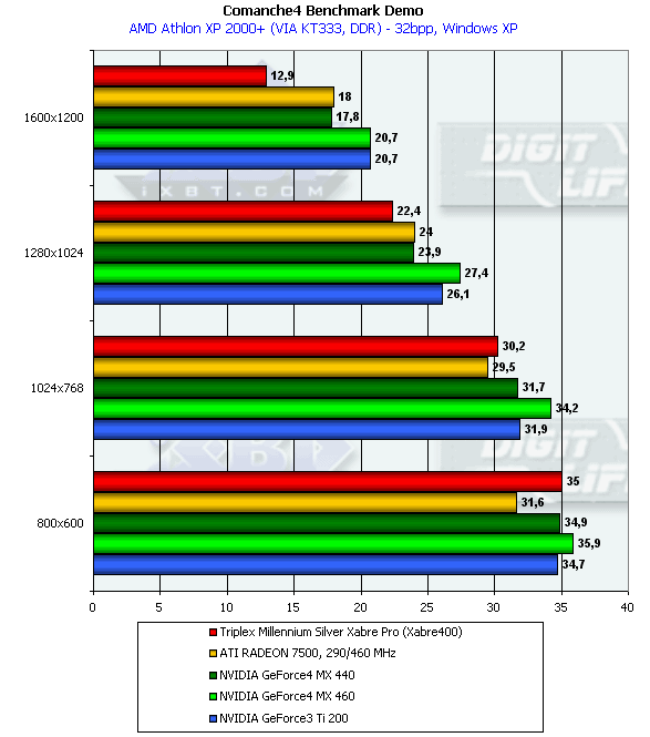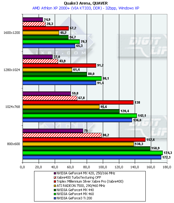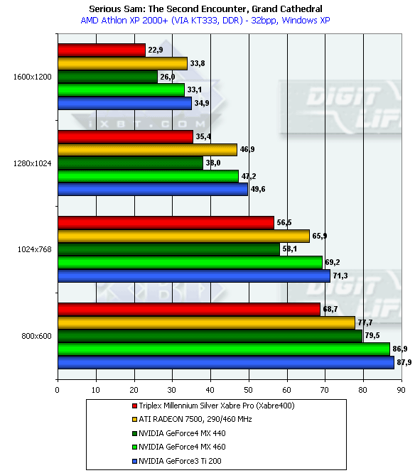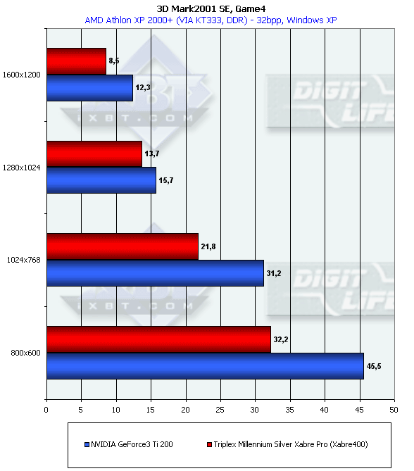 Мы видим, что производительность в старших разрешениях падает почти вдвое! И данная карта становится уже конкурентом всего лишь GeForce4 MX420. Любопытно узнать реальные розничные цены на Xabre, чтобы потом понять - будет кому-то нужна такая карта или нет.