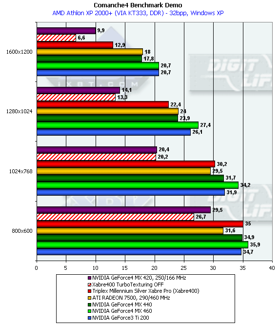 - Comanche4 Benchmark Demo (NovaLogic) DirectX 8.1, мультитекстурирование, настройки тестирования все на максимум, S3TC OFF.