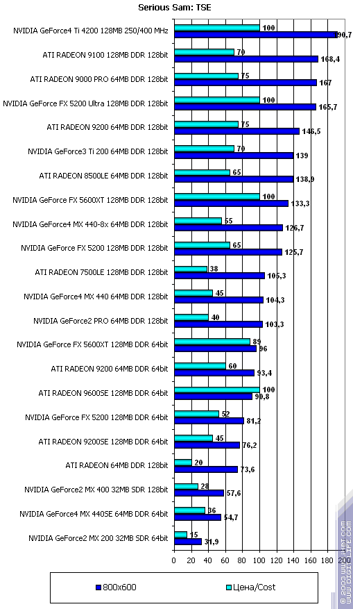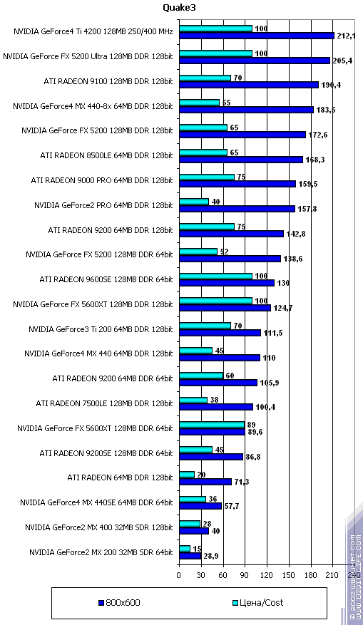 Примечание: В описание карт на диаграммах вкралась опечатка. Следует читать "ATI RADEON 9200 128MB DDR 128bit" вместо "ATI RADEON 9200 64MB DDR 128bit"