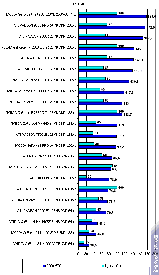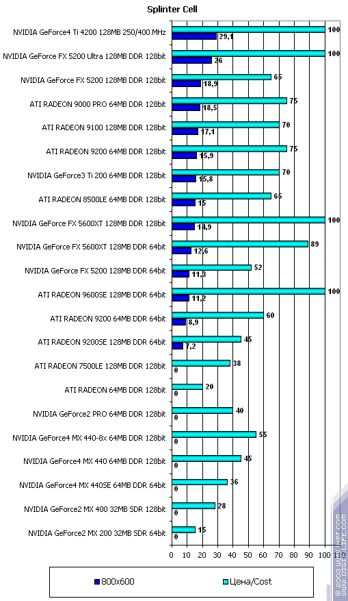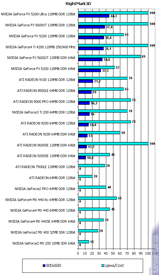 Надо отметить, что две видеокарты приняты в этот сегмент с некоторой натяжкой: это GeForce FX 5200 Ultra (цены на которые пока ниже 100 долларов редко можно найти), а также новинка GeForce FX 5600 XT 128bit, стоимость которой из-за особенностей национальной торговли новинками в России, пока выше 100 долларов, однако, думаю, что через месяц уже опустится до граничной цифры.