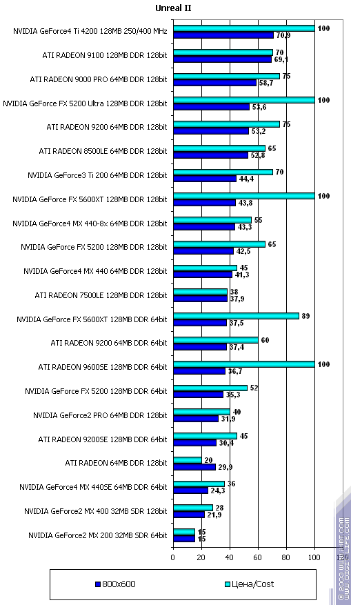 ВСЕ ТЕСТЫ СНЯТЫ В ОДНОМ разрешении 800х600 при 32-битной глубине цвета. Это сделано ради слабых карт, которые в разрешении 1024х768 уже будут давать совершенно неиграбельные показатели. И так, даже в 800х600, как покажут тесты, в ряде сложных тестов скорость просто никакая!