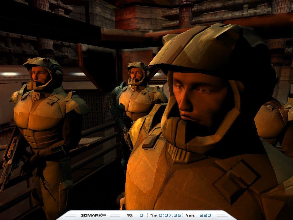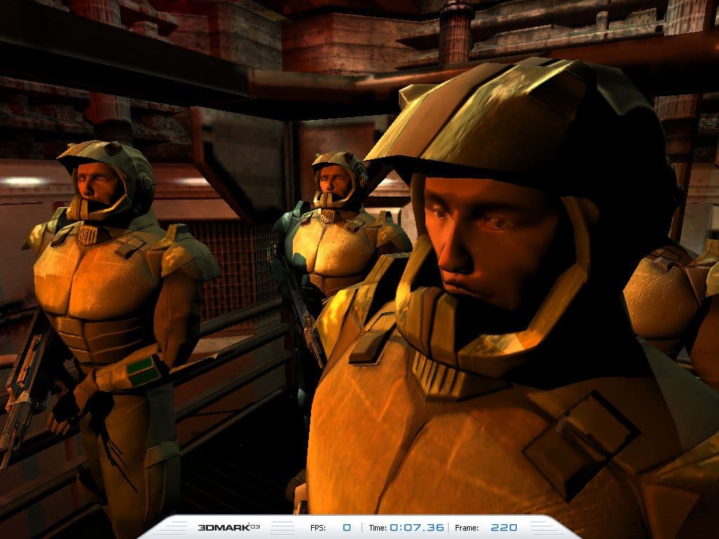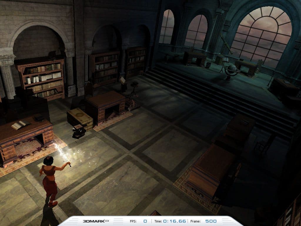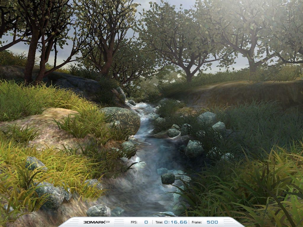 - DirectX 7.0 тест; примерно 32000 полигонов в сцене, под текстуры используется 16 мегабайт видеопамяти, 6 мегабайт для буферов под вершины и 1 мегабайт для индексов.
