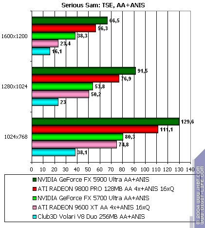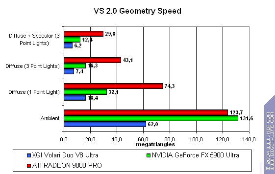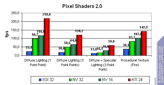 Очевидно, что продукт от XGI проиграл просто по-страшному! Заметим, что часто эта карта отстает даже от середняков, таких как FX 5700 Ultra и RADEON 9600 XT. Особенно снова видно поражение при работе с шейдерами.