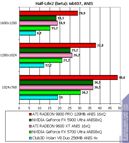 - Half-Life2 (Valve/Sierra) DirectX 9.0, две разных записанных demo (ixbt07 и coast). Тестирование проводилось при включенной анизотропной фильтрации, а также в тяжелом режиме с АА и анизотропией.