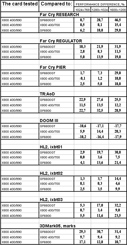 Перед тем, как читатели ознакомятся со сводными диаграммами, где можно найти рядовую X800, я хочу дать таблицу с процентами, где видно, на сколько данный продукт опережает reference X800 с частотами 400/700 МГц. Если кто-то из читателей хочет узнать фактические цифры, то вот ссылка на XLS-файл с данными.