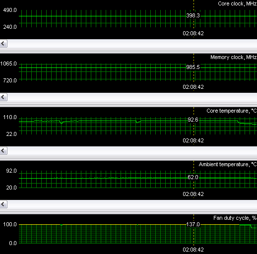 Как мы видим, нагрев ядра весьма высок, до 92 градусов. Хотя никаких нареканий замечено не было, да и артефактов тоже. В таком режиме карта гонялась 8 часов подряд в 3D. И я привел выше тот момент, где были максимальные значения температуры на чипе.