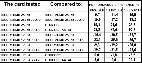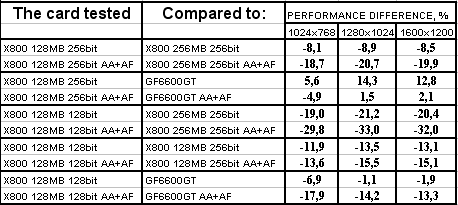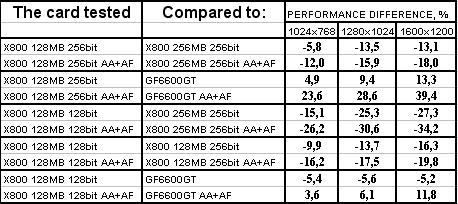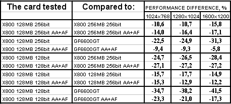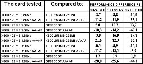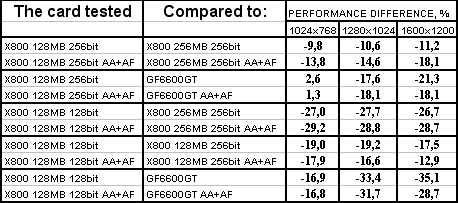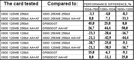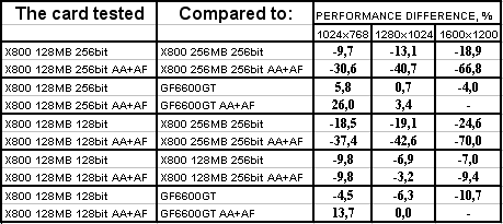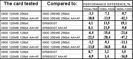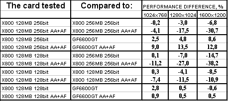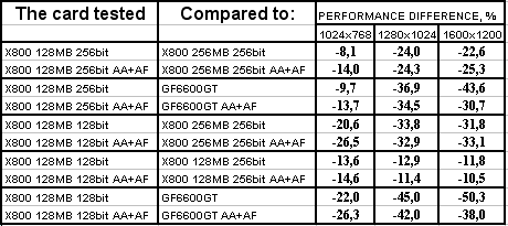 GeCube RADEON X800 128MB 256bit PCI-E оказалась в проигрыше перед соперником в лице X800 256MB 256bit, при этом разница достигает 18% в тяжелых режимах. Думаю, что здесь сказался, не столько объем памяти, а сколько разница в частотах работы памяти. Однако этот же продукт успешно отвоевал победу у GeForce 6600GT.