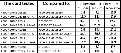 Отставание GeCube RADEON X800 128MB 256bit PCI-E от Gigabyte RADEON X800 256MB 256bit PCI-E (GV-RX80256D) полностью связано с разными частотами работы памяти, ведь с ростом разрешения разрыв сильно увеличивается.
