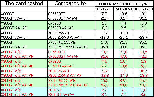 Отличный результат для X800GT. Новинка смогла обойти 6600GT, особенно в тяжелых режимах (где подспорьем явилась 256-битная шина), и продемонстрировала примерный паритет с пока еще более дорогим 6800. И очевиден перевес над более слабым X700 PRO.