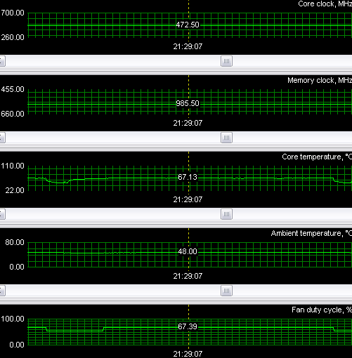 Теперь о разгоне. Экземпляры, что попали ко мне, смогли устойчиво работать только на частотах 510-513 МГц по ядру. Да, и разгон не ахти. Я лично не верю, когда говорят о 560 МГц на таких картах… На 15-20 минут — да, возможно. Тесты прогнать успеть можно. И все. При таких условиях у меня карты и на 540 МГц по ядру работали, но в течение часа… Потом зависание… Это не разгон. Разгоном, мало-мальски гарантирующим работу карты на повышенных частотах, я называю режим, когда в таких условиях плата функционирует как минимум 6-8 часов подряд, а то и сутки.