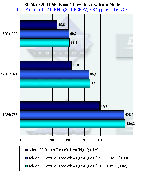 Но это на старой версии драйверов. Мы же провели тестирование на самой последней версии драйверов 3.03, поэтому сможем сравнить, как изменилась производительность. Заодно и проверим, насколько она падает при выключении Турборежима (TurboMode=0). Ну и, разумеется, сравним производительности 64-х и 128-мегабайтной карт.