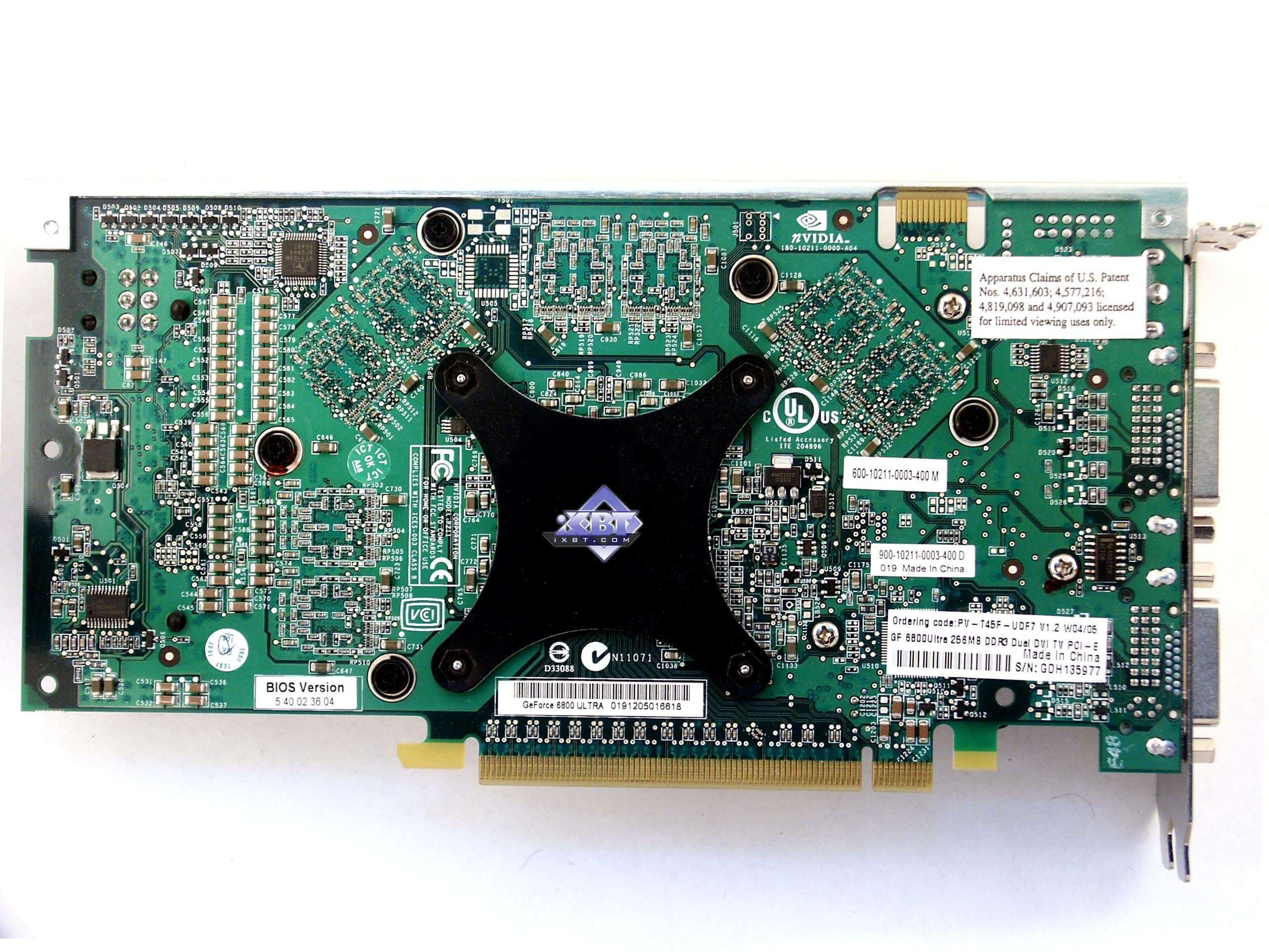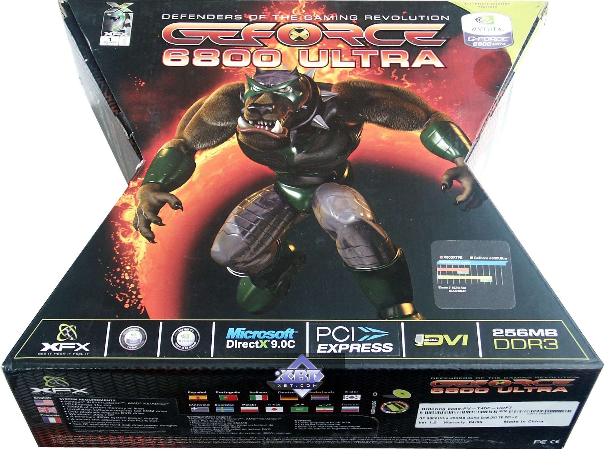- XFX GeForce 6800 Ultra PCI-E 256MB — аналогично первому выводу. Также приятно, что частота ядра 425 МГц, цена упала весьма сильно, поэтому продукт может стать привлекательным. Поскольку это тоже reference card, изготовленная по заказу NVIDIA, то качество очень высокое, нареканий нет. Минусом является отсутствие разреза для разъема SLI в верхней планке жесткости, поэтому для использования карты в SLI придется снимать всю планку.