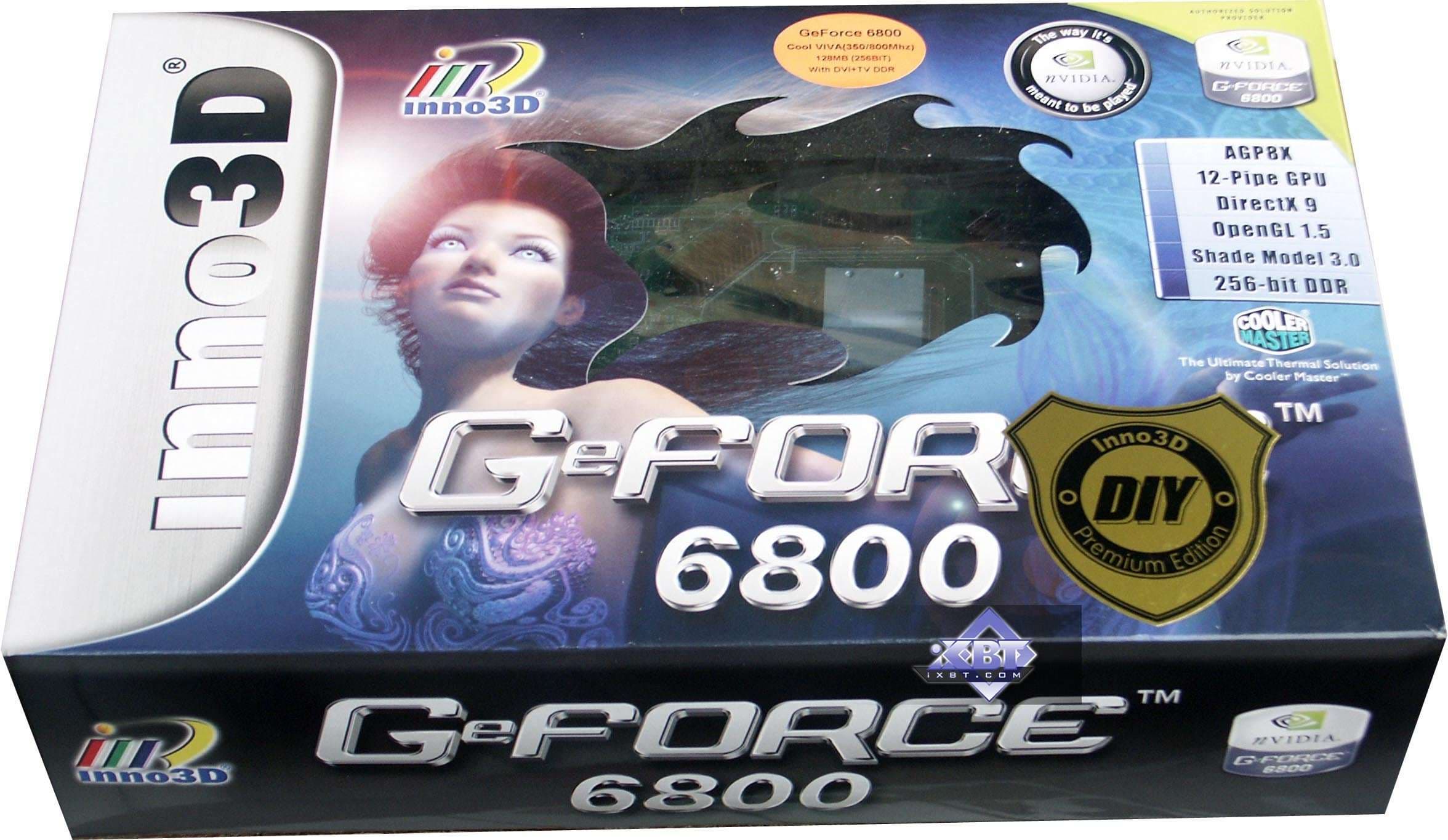 - Inno3D GeForce 6800 Premium Edition AGP 128MB — продукт для уходящего со сцены AGP-сектора. Уже имеет солидный возраст, однако до сих пор весьма актуален. И не забываем, что карты основаны на NV40, и потому есть шанс разблокировать конвейеры с помощью RivaTuner, и получить, по сути, почти 6800 GT, но со 128-ю мегабайтами памяти, работающей на более низких частотах. Продукт исполнен отлично, нареканий нет. Конечно, поставка кулера отдельно от карты накладывает свои минусы (можно забыть о нем при получении платы со склада), и малопонятно, почему нельзя было одеть кулер еще на заводе (ширина упаковки легко позволяет уместить туда карту в сборе). Ведь базовые крепежи все же одеты…