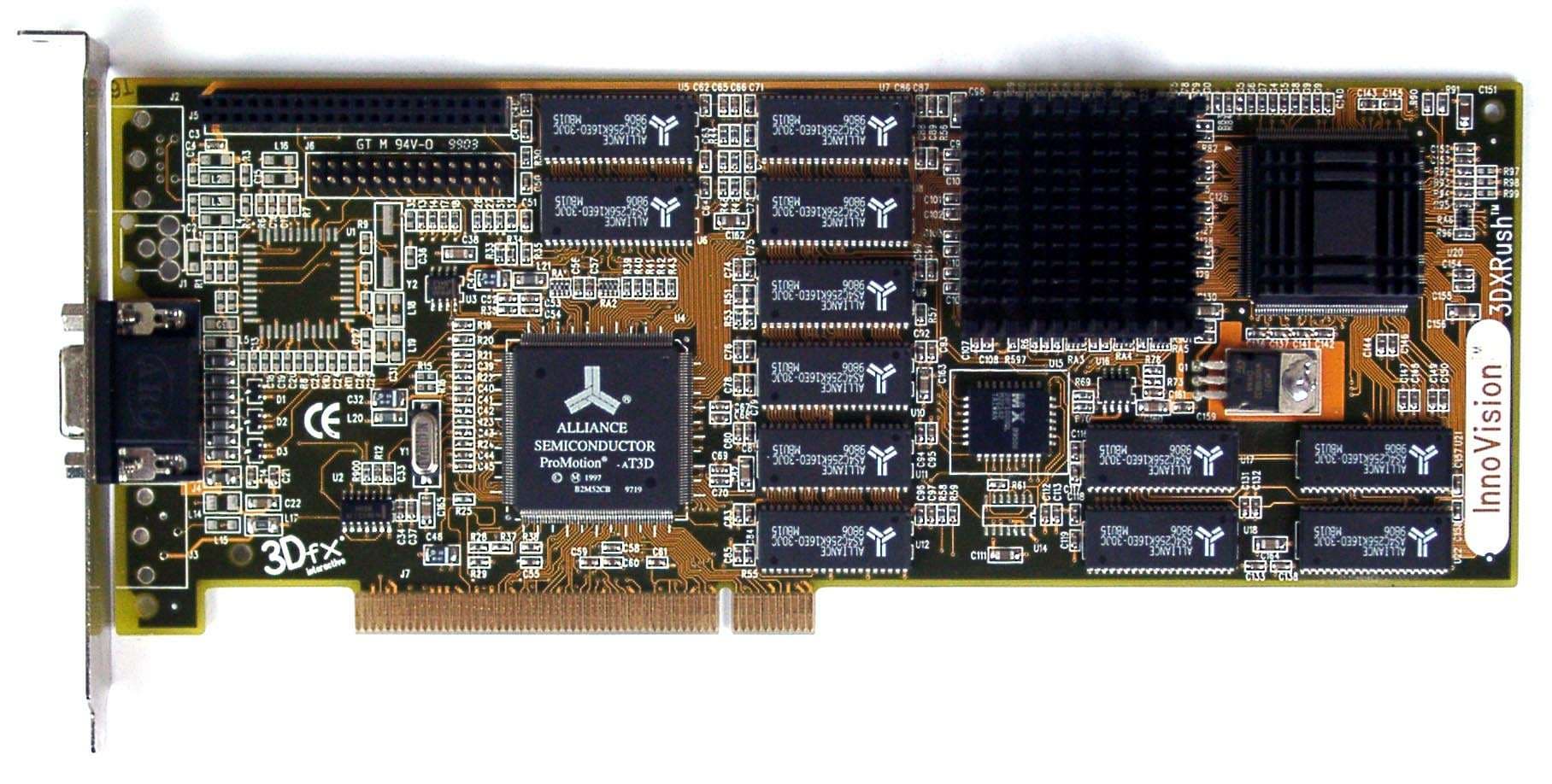 Именно поэтому те, кому была важна сильная поддержка видео, предпочитали брать ощутимо более дешевые ATI Rage/II, а за 3D отвечала отдельная плата. Да да, тот самый Voodoo Graphics.