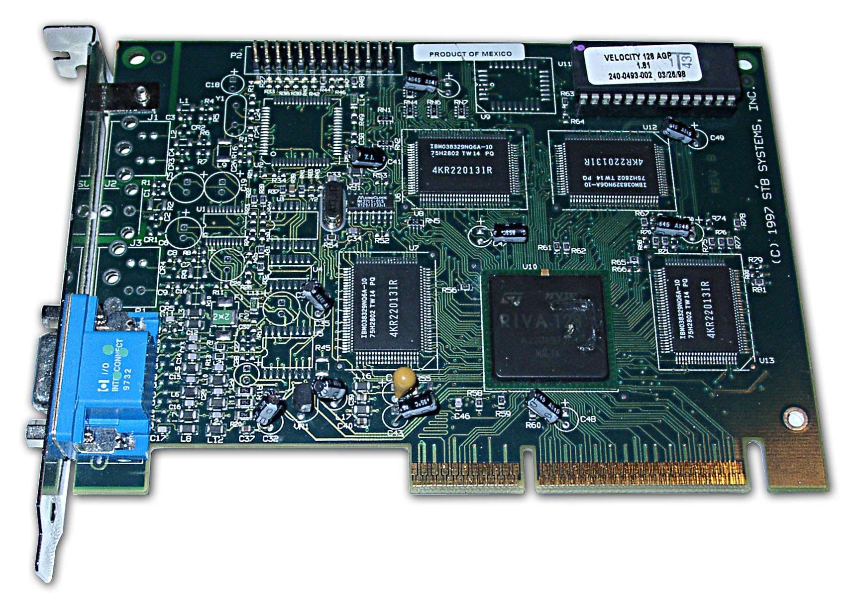 Особого упоминания заслуживает, пожалуй, самый серьезный соперник, замаячивший на безоблачном небосводе благополучия 3Dfx — RIVA 128, позднее чуть усовершенствованный в RIVA 128zx. Новый продукт Nvidia вышел под звучной аббревиатурой, за которой скрывалось Realtime Interactive Video and Animation (Интерактивное Видео и Анимация в Реальном времени). В отличие от своих конкурентов, 3D-часть была более чем достойной с точки зрения характеристик. 4 или 8 (для RIVA 128zx с RAMDAC 250MHz и AGP 2x) мегабайт быстрой SDRAM / SGRAM памяти помогали интенсифицировать обмен данными с графическим чипом, но ключевая особенность решения была в другом. Главной инновацией стала возможность обсчета сразу двух пикселей за один такт — вполне логичный шаг, учитывая возможность распараллеливания таких вычислений. Это позволило RIVA 128 достичь небывалой для того времени пиковой скорости заполнения в 100 миллионов пикселей в секунду (для сравнения, уже несовременный ATI Radeon X850 XT PE имеет скорость заполнения 9.28 миллиарда пикселей в секунду).