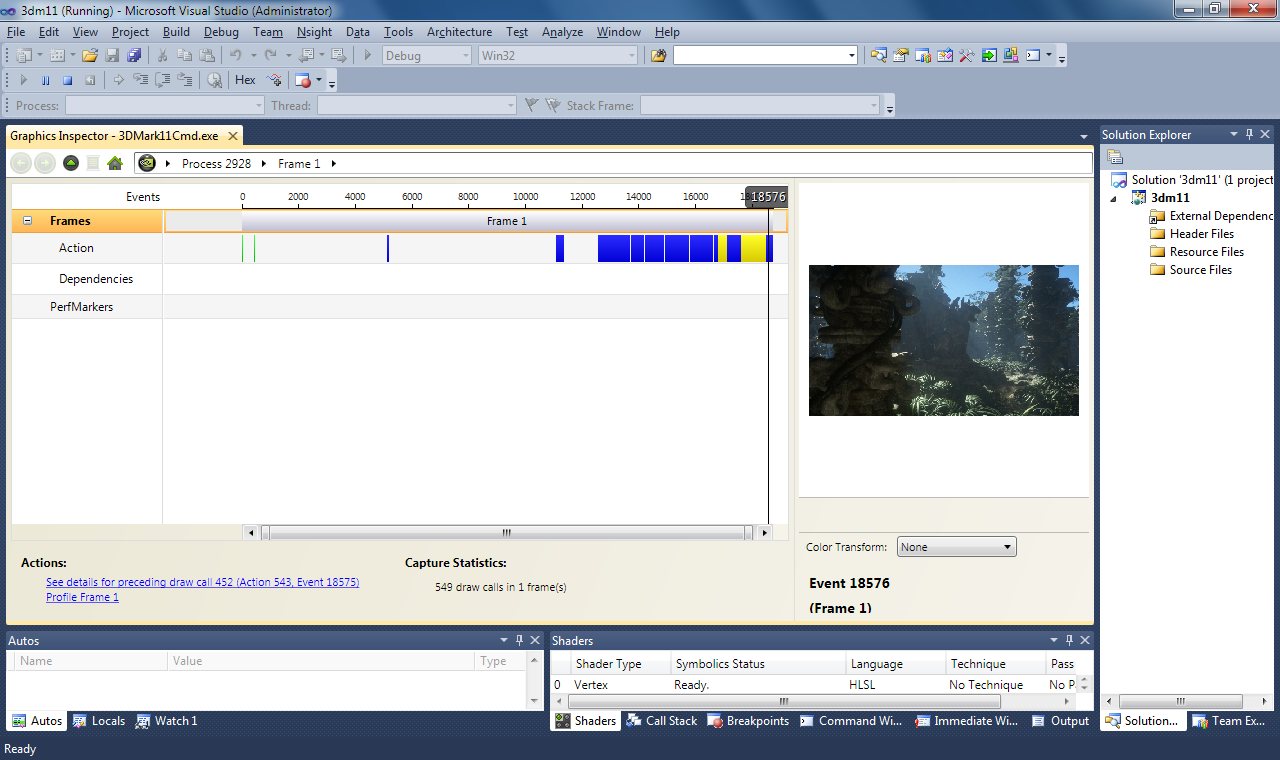 Для тщательного исследования 3DMark 11 мы использовали пакет Nvidia Parallel Nsight, предназначенный для 3D и CUDA разработчиков и поддерживающий D3D10 и D3D11 приложения. Публичные версии пакета, начиная с 1.51, позволяют исследовать в том числе и 3DMark 11, чем мы и не преминули воспользоваться.