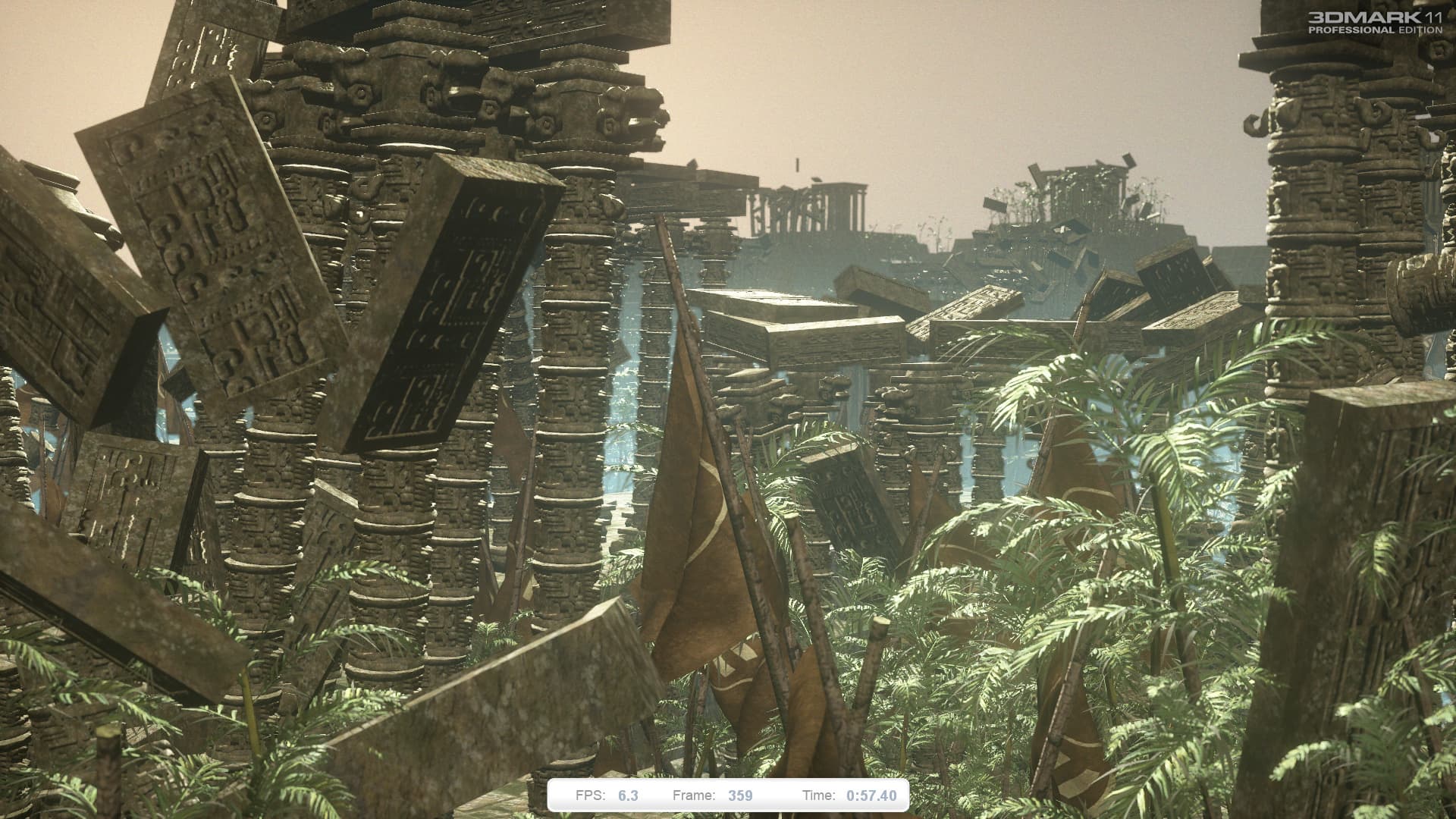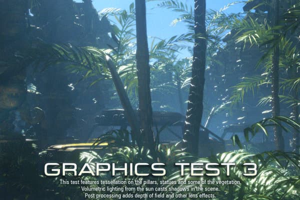 Третий графический тест основан на сцене «High Temple», в которой используется несколько источников света. Для одного из них рассчитываются тени, он же является ещё и объёмным. Уровень тесселяции на колоннах, статуях и растительности также средний. Постфильтрация используется и в этом случае.