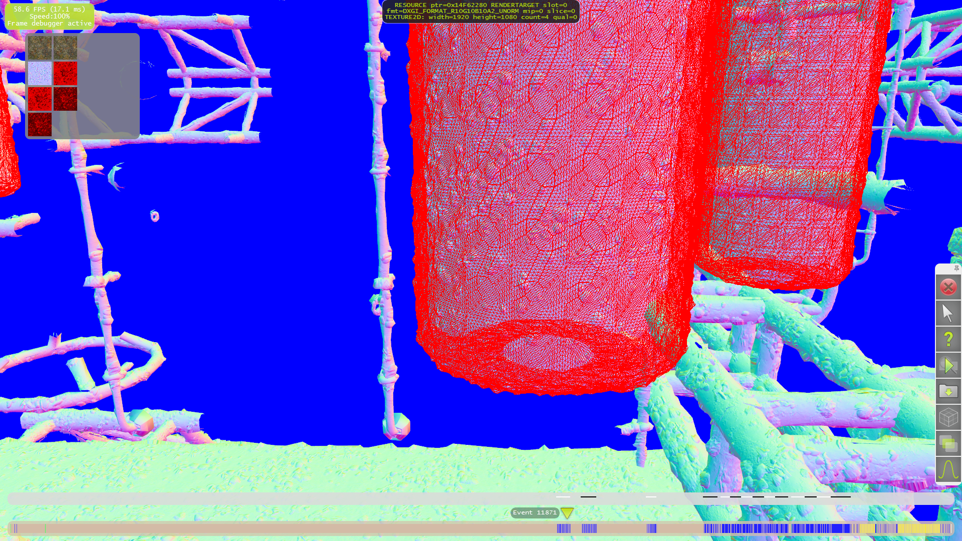 Для начала разберём тесселяцию. Как видно на следующих примерах, только для нескольких объектов на переднем плане применяются высокие степени разбиения. А на средних и дальних дистанциях геометрической детализации явно не хватает. Что приводит к выводу о том, что выбранная схема детализации (LOD) весьма странная — размер дальних треугольников слишком большой, а ближних — порой (но далеко не всегда) слишком маленький.