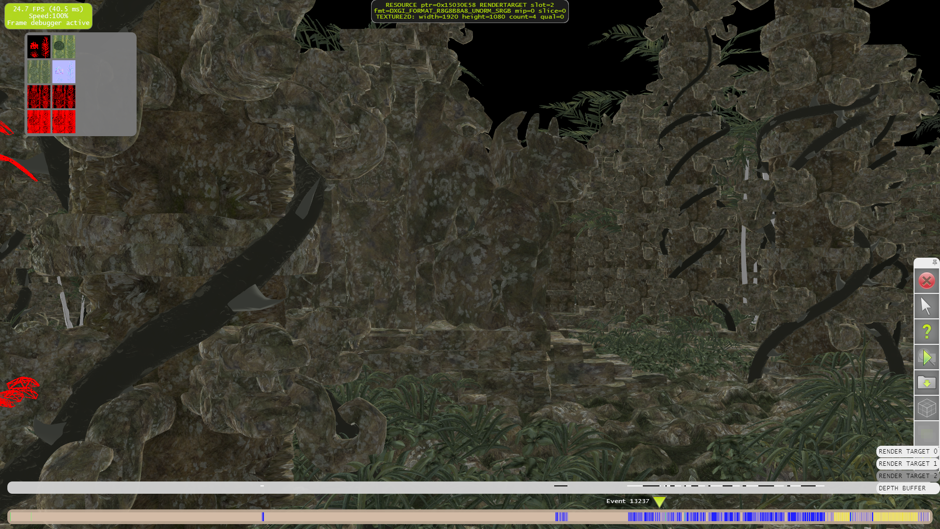 Все объекты отрисовываются в трёх- или четырёхслойный G-buffer: нормали + покрытие (coverage), диффузная (diffuse) составляющая, бликовая (specular) составляющая. Для буфера нормалей применяется формат R10G10B10A2, для двух других — R8G8B8A8_SRGB. Геометрия отрисовывается в них при помощи MRT. А ещё один слой используется для рендеринга объектов, излучающих свет: фонари, солнце, луна и т.п.