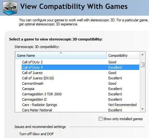 Настройка стереодрайвера осуществляется при помощи панели управления Nvidia Control Panel. На странице совместимости с играми можно посмотреть список игр (всех или только установленных в системе пользователя) с указанием уровня совместимости со стереорендерингом для каждой из них. Также упомянуты и параметры внутриигровых настроек, которые необходимо выполнить для лучшего качества стереоэффекта. Чаще всего приходится отключать эффекты постобработки, которые выполняются в 2D и делают картинку плоской.