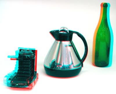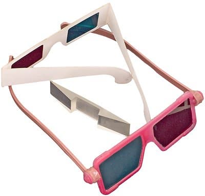 Но шлемы это, пожалуй, самый дорогой метод стереовидения, а ведь есть и крайне дешёвый метод анаглифный. При этом зрителю нужно использовать специальные анаглифические очки, которые обычно очень просты и дёшевы, зачастую выполнены из пластмассы или даже картона, с простыми цветными светофильтрами вместо линз. Чаще всего цвет светофильтра для левого глаза красный, а для правого голубой.