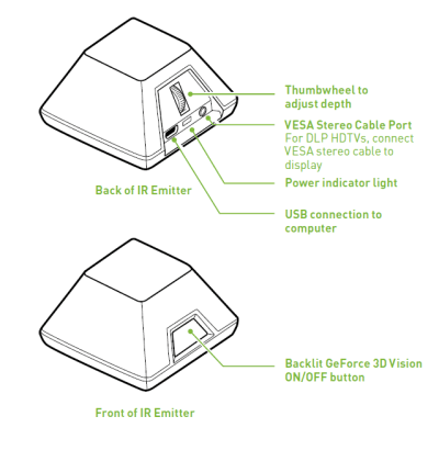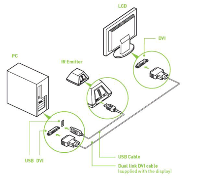 Физически всё подключается очень просто: монитор или телевизор с видеокартой соединяется как всегда, при помощи DVI- или HDMI-кабеля (разве что в случае DLP понадобится ещё и специальный VESA stereo кабель, входящий в комплект поставки). ИК-передатчик 3D Vision присоединяется к любому USB-порту компьютера обычным кабелем и с аппаратной стороны всё готово, остаётся лишь установить стереодрайвер.