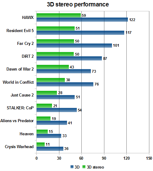 Ну а что там с 3D-производительностью в стереорежиме, спросите вы? Хватает ли производительности даже самых мощных GPU в современных играх? Ведь для стереорендеринга нужно выполнить вдвое больше работы, чем для создания привычного плоского изображения. Мы провели тесты в нескольких распространённых играх на нашей обычной тестовой системе при использовании топовой видеокарты Geforce GTX 480 и предлагаем посмотреть на сравнительную скорость рендеринга в обычном и стереорежиме.