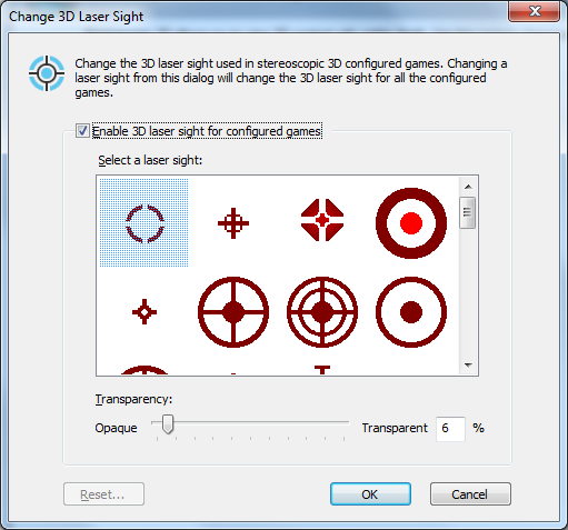 Для решения данной проблемы, в стереодрайвере 3D Vision есть встроенная возможность отрисовки прицела на правильной глубине. Если в рекомендациях для конкретной игры написано, что для корректной отрисовки нужно использовать прицел Nvidia, тогда нужно открыть панель настроек Nvidia, закладку стереоскопического 3D «Stereoscopic 3D» и выбрать настройку «Change 3D Laser Sight».