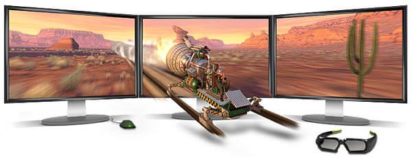 С выходом решений линейки Geforce GTX 400 компания Nvidia развила идею, предложив возможность вывода стереоизображения сразу на три устройства. Но для использования этой технологии нужны две видеокарты Nvidia, работающие в конфигурации SLI. С ними, при помощи технологии 3D Vision Surround, можно получить стереоизображение высокого разрешения сразу на трёх мониторах, что выглядит очень эффектно.