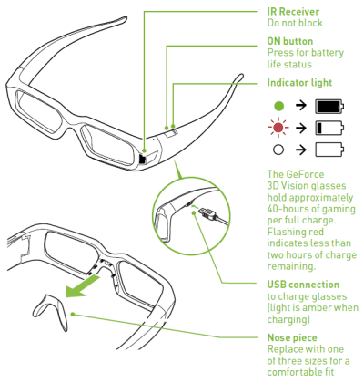Очки Nvidia можно надевать поверх диоптрических, а для большего удобства в комплект входит несколько различных вставок для переносицы. В отличие от старинных аналогов, которые читатели могут помнить со времён расцвета ПК-игр, очки Nvidia беспроводные. Передача данных синхронизации от ИК-передатчика гарантирована на расстоянии до шести метров, чего вполне достаточно для комфортного просмотра стереокартинки на экране. Причем можно использовать более чем один комплект очков одновременно.