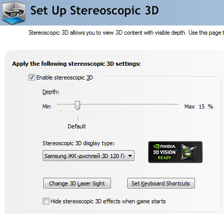 В другом разделе, посвящённом 3D Vision, находятся настройки самого стереорендеринга. Там можно изменить глубину, выбрать устройство вывода стереокартинки, вид «лазерного» прицела для шутеров (см. далее), запустить тест стерео, а также настроить «горячие» клавиши для определения некоторых стереопараметров.