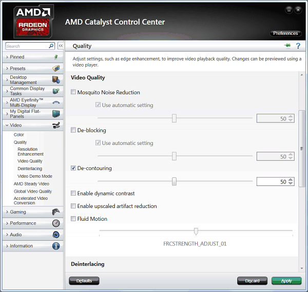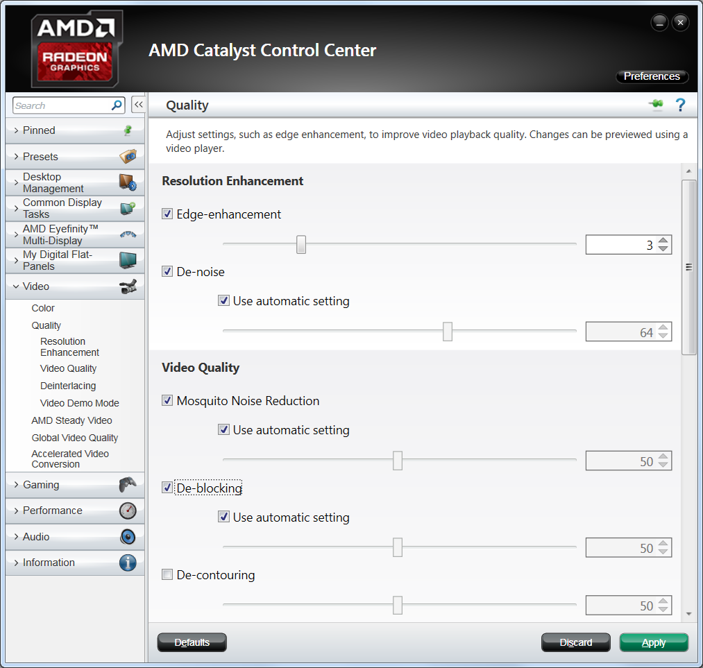 Для включения этих возможностей в Catalyst Control Center на странице «Качество видео» нужно включить параметры: «Улучшение резкости на краях» («Edge-enhancement»), «Подавление шумов» («De-noise»), «Подавление высокочастотных шумов» («Mosquito Noise Reduction») и «Подавление блочности» («De-blocking»), все они имеют возможность тонкой регулировки степени обработки: