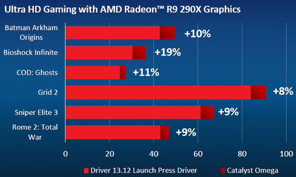 Улучшение производительности для графических процессоров компании AMD от нового драйвера будет заметно во многих играх. AMD измерила частоту кадров в нескольких играх на системе с видеокартой модели Radeon R9 290X в разрешении рендеринга 3840×2160, получив приросты до 19%, но увы — в этот раз они сравнивают скорость нового ПО с еще более старым драйвером версии Catalyst 13.12: