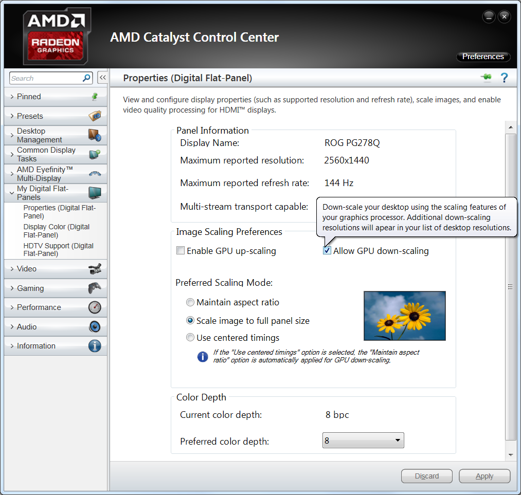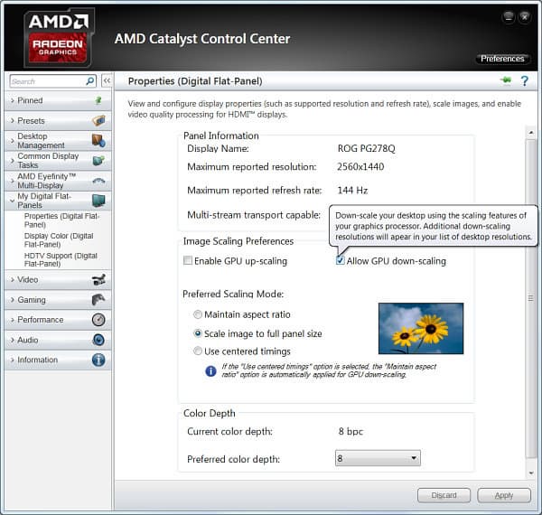 Виртуальное разрешение VSR можно включить через AMD Catalyst Control Center — на странице «Свойства (Цифровая плоская панель)» («Properties — Digital Flat Panel») нужно включить настройку «Разрешить уменьшить масштаб видеокарты» («Allow GPU down-scaling»), аналогичную такой же настройке для GPU-масштабирования картинки из меньшего разрешения.