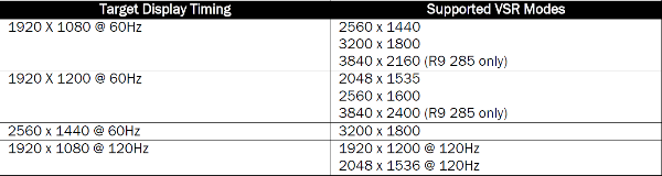 Аппаратные требования VSR довольно жесткие, технология работает на одно- или многопроцессорных конфигурациях на базе видеокарт моделей AMD Radeon R9 295X2, R9 290(X) или R9 285. Впрочем, GPU меньшей мощности все равно не могли бы обеспечить нужную производительность. А недостаток VSR, на наш взгляд, заключается в его недостаточной гибкости в смысле выбора разрешений виртуального монитора, так как на топовых видеокартах поддерживаются виртуальные разрешения всего лишь до 3200×1800 пикселей, и только в случае Radeon R9 285, основанного на графическом чипе Tonga, разрешение можно повысить до 3840×2160: