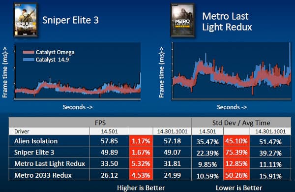 Тесты проводились в нескольких играх на системе с APU модели AMD A10-7850K с дополнительной видеокартой AMD Radeon R7 250, сравнивался новый драйвер AMD Catalyst Omega (внутренняя версия 14.501) с версией AMD Catalyst 14.9 в разрешении рендеринга 1920×1080 при средних настройках качества. Как видно по графикам и таблице, новая версия Catalyst явно лучше справляется с работой разношерстных графических ядер, выдавая более плавную смену кадров при небольшом росте FPS.