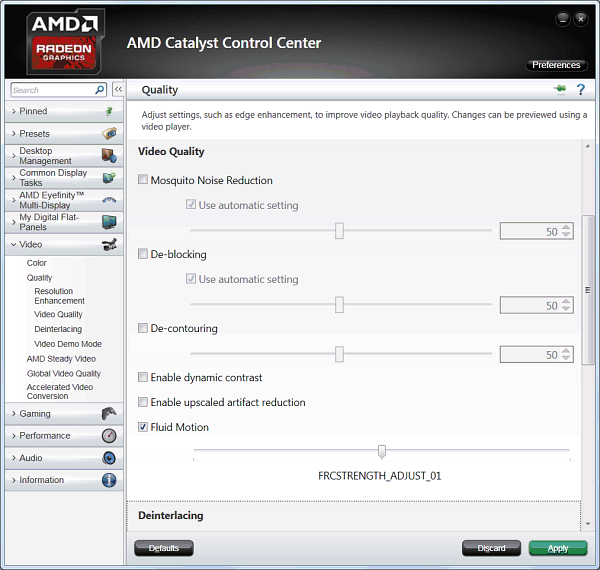 Для включения технологии Fluid Motion Video в AMD Catalyst Control Center (CCC) нужно открыть панель «Параметры» в режиме «Расширенное представление» и на странице «Качество видео» включить параметр «Плавное движение» («Fluid Motion»), передвинув ползунок на один из трех уровней качества.