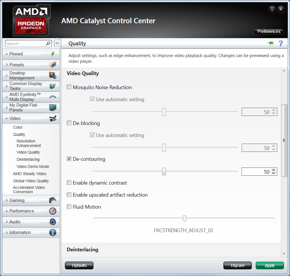 Включить данную возможность можно в Catalyst Control Center на странице «Качество видео» — она называется «Размытие контуров» («De-contouring»). Улучшение контуров работает на APU моделей Athlon и AMD 7x00 с потреблением энергии 25 Вт и выше, а также на всех видеокартах Radeon, начиная от модели R7 260.
