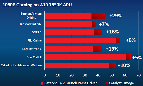 В случае версии AMD Catalyst Omega компания декларирует куда большие приросты, но... она сравнивает скорость настольных GPU и APU на новейших драйверах и очень старых версиях — вроде Catalyst 14.2, которые вышли во время анонса решений серии APU под общим названием AMD 7000. И в таком сравнении для своих гибридных процессоров APU компания AMD декларирует увеличение производительности на величину до 29% (наблюдается на системе, основанной на чипе AMD A10-7850K в игре Batman Arkham Origins):