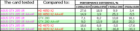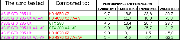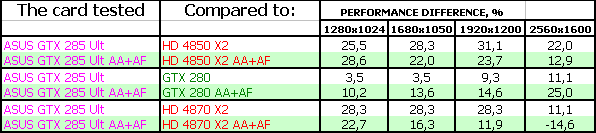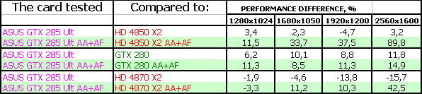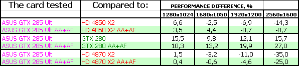 Напомним, что тесты GTX 295 показали, что технология объединения двух ядер через драйвер или иное ПО, как мы и говорили, имеет массу потенциальных подводных камней. То есть мы еще раз предупреждаем тех, кто гонится за самым мощным и сильным: будьте готовы к тому, что в какой-то новой игре ваш двухпроцессорный ускоритель может не показать супер быструю производительность, просто потому, что драйвер пока еще не поддерживает данную игру. Мы надеемся на то, что программисты Nvidia (как и AMD для 4870 Х2) смогут оперативно и качественно включать поддержки всех новых игр в свои драйверы.