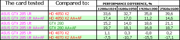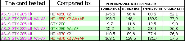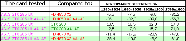 В-третьих, посмотрим на тесты рассматриваемых сегодня карт. Анализ каждого теста проводить не будем, в конце тестов подведем итоги. Сразу же отмечу, что тесты почти точно такой же 4870 карты, как и в данном случае, мы уже проводили ранее, поэтому читатель может ознакомиться с результатами ниже. Производительность рассматриваемого сегодня 4850 стандартна, как и GTX 295. Поэтому мы акцентируем внимание на результатах GTX 285 Ultimate (производительность GTX 285 TOP лежит между Ultimate и стандартным GTX 285, поэтому читатель может самостоятельно сделать выводы).