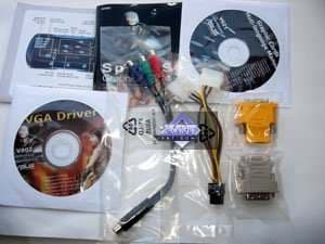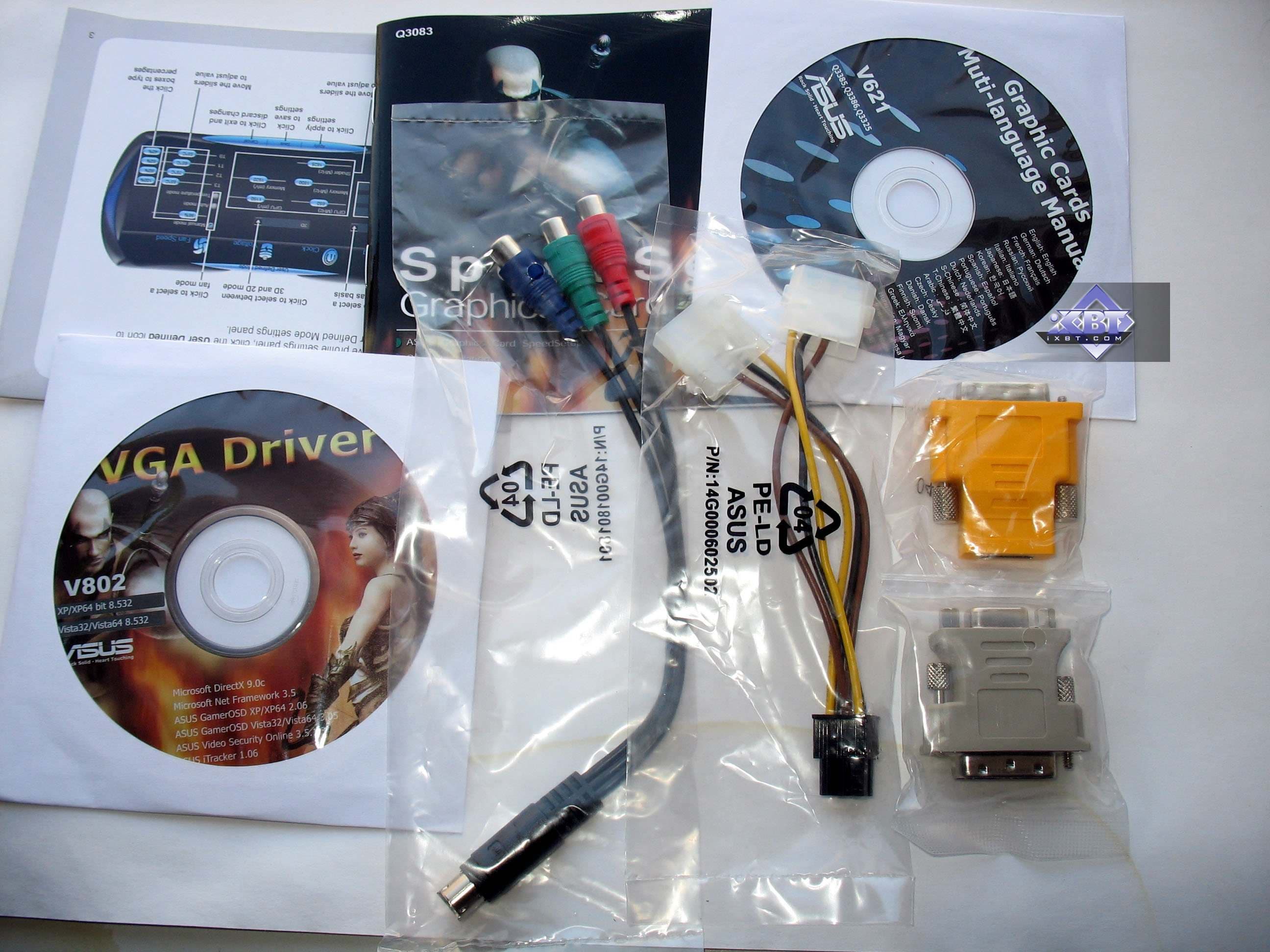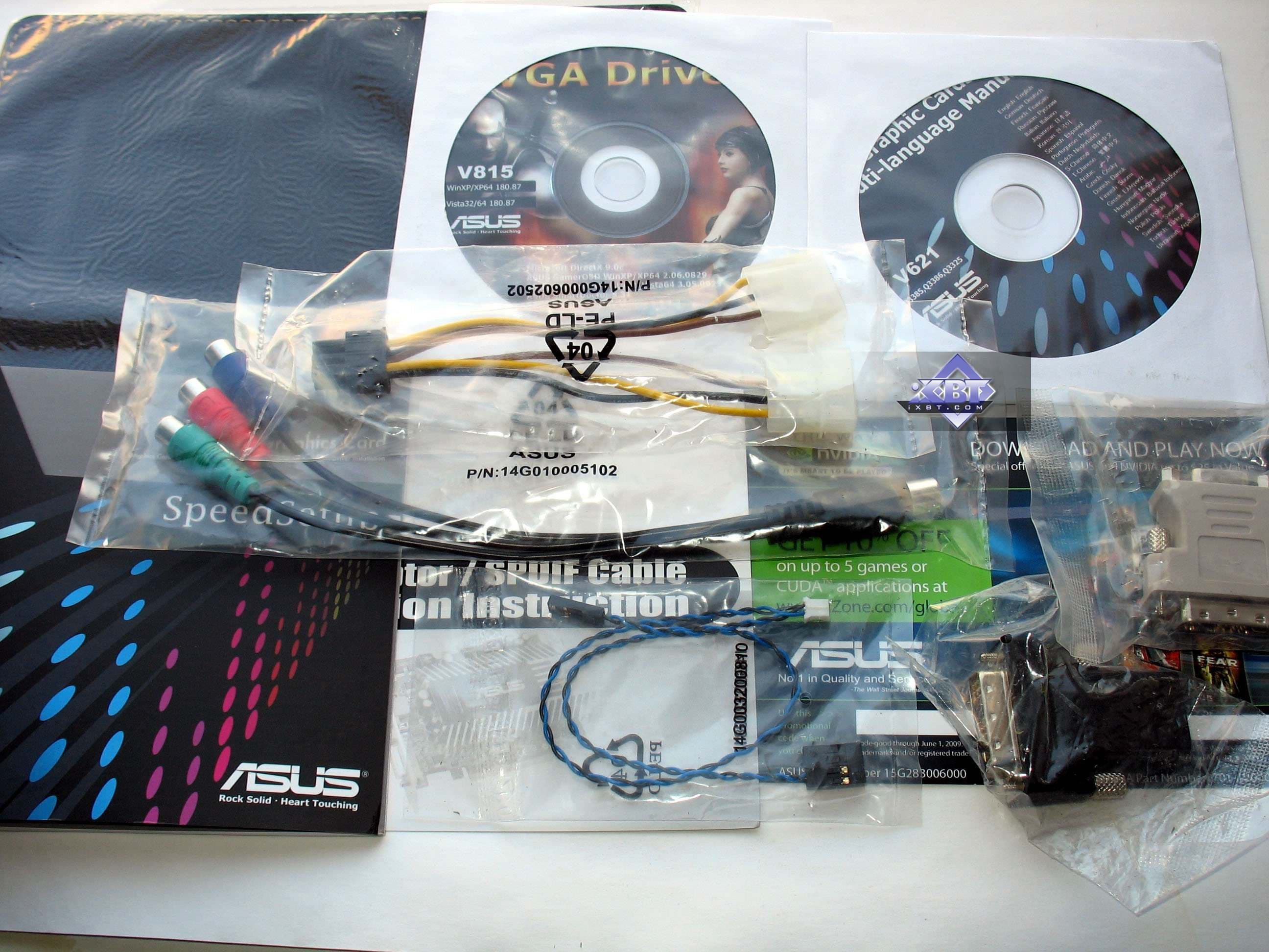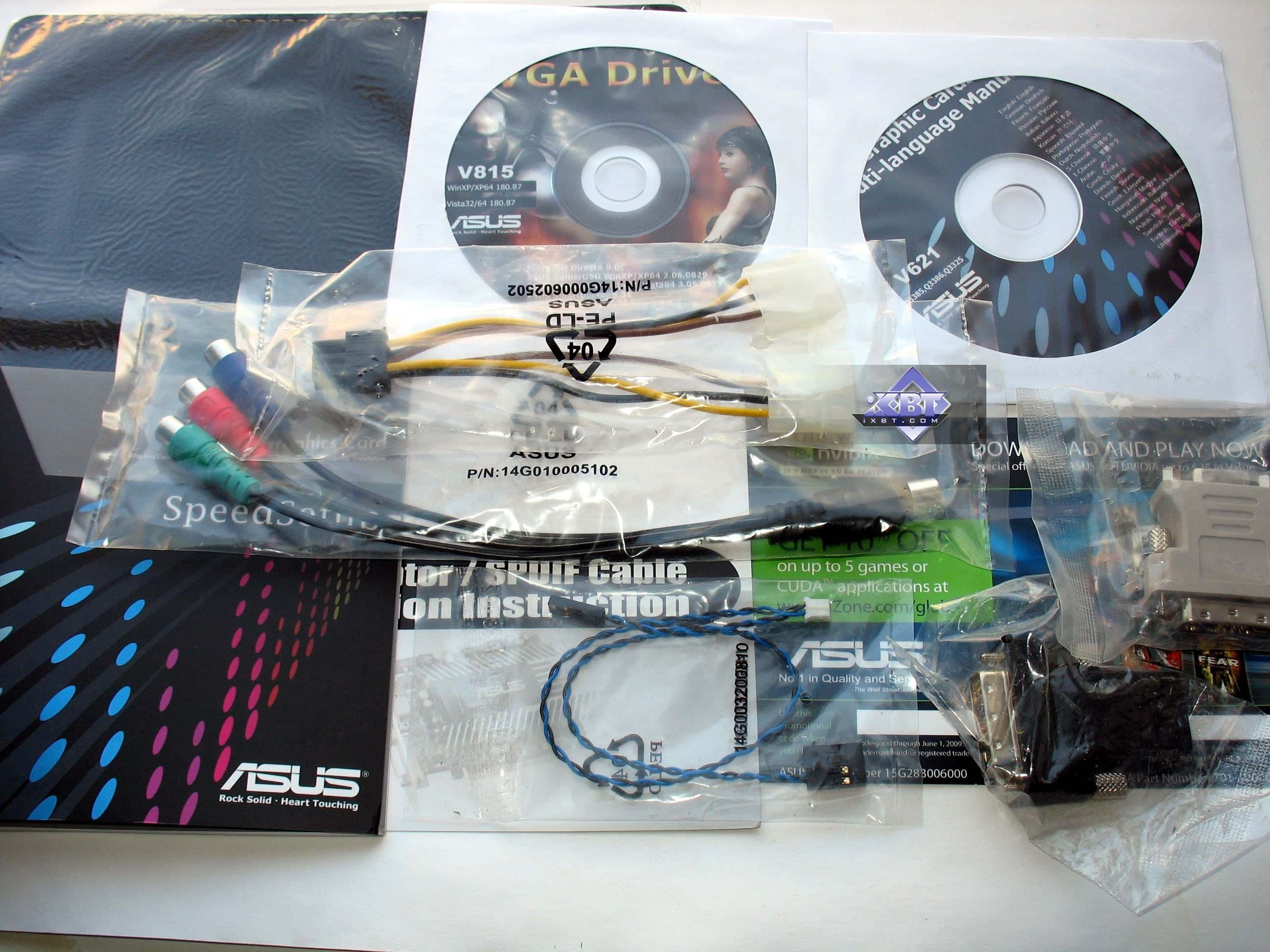 Базовый комплект поставки должен включать в себя: руководство пользователя, диск с драйверами и утилитами, переходник-адаптер DVI-to-VGA, DVI-to-HMDI адаптер (кроме GTX 295), адаптер компонентного вывода (TV-out), аудио-шнурок для вывода на HDMI (для Geforce-карт), а также разветвители внешнего питания. Далее, мы покажем, что предлагается к каждой карте дополнительно.