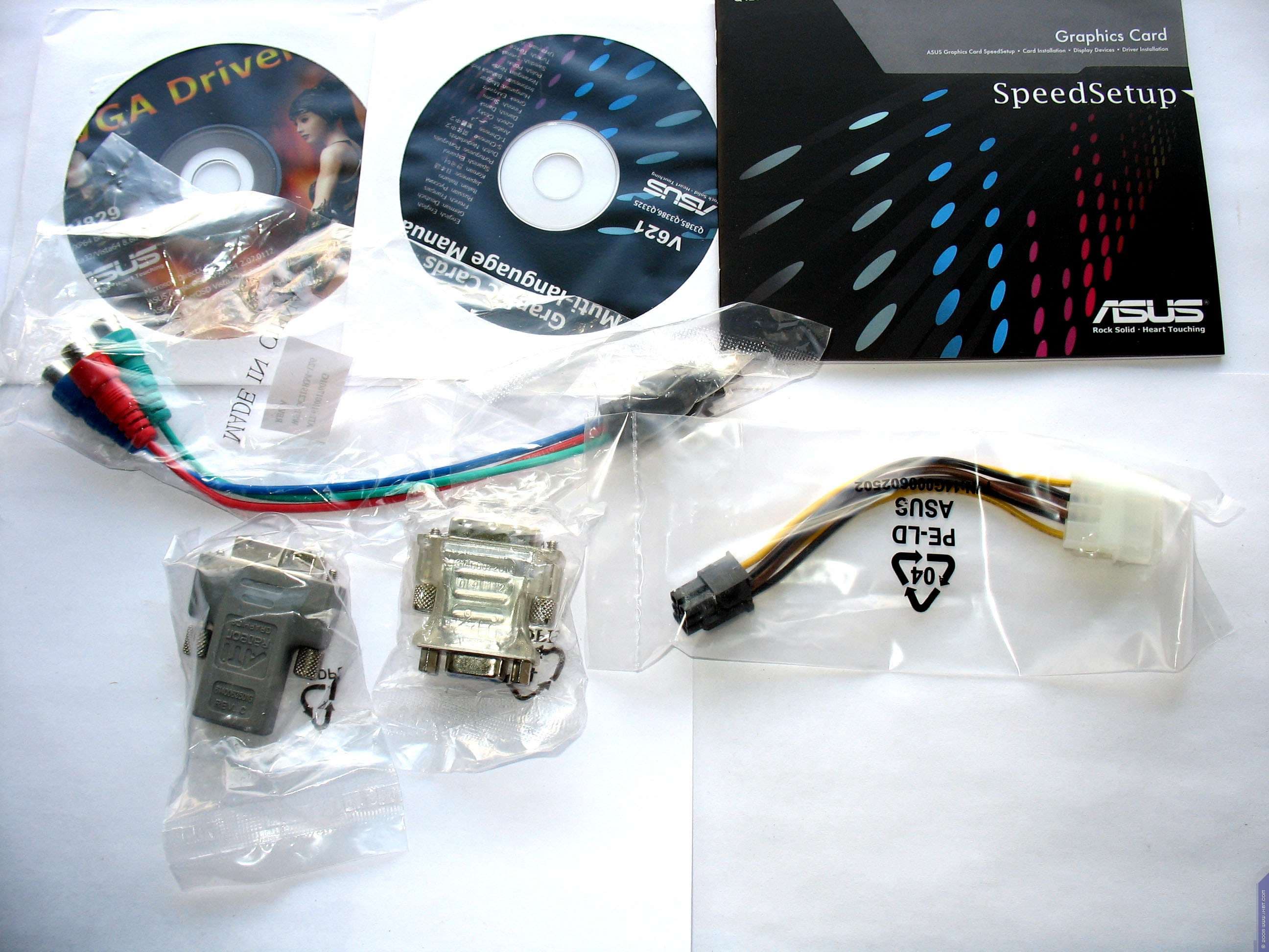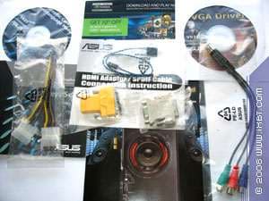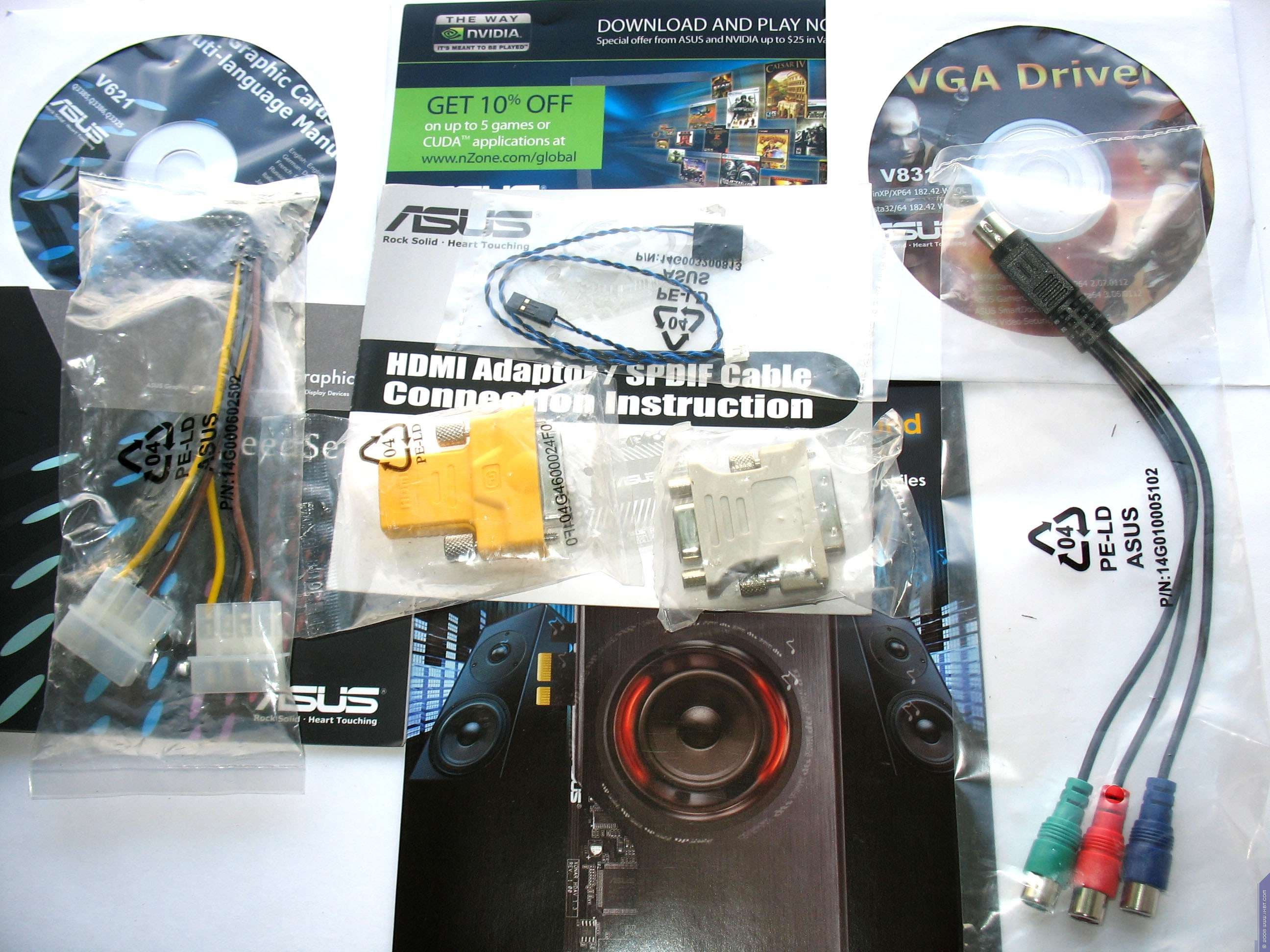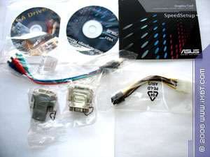 Базовый комплект поставки должен включать в себя: руководство пользователя, диск с драйверами и утилитами, переходник-адаптер DVI-to-VGA, DVI-to-HMDI адаптер, адаптер компонентного вывода (TV-out), аудио-шнурок для вывода на HDMI (для Geforce-карт), а также разветвители внешнего питания. Далее, мы покажем, что предлагается к каждой карте дополнительно.