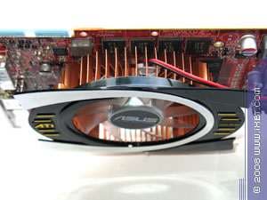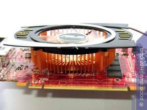 Устройство представляет собой цилиндрический радиатор с ребрами охлаждения по боковой. Радиатор весьма большой, потому СО получилась двухслотовой (карта вместе с ней занимает 2 слота в материнской плате). В центре радиатора — большой малооборотистый вентилятор. Банальная схема, уже виденная нами не один год. Для украшения кулер снабжен овальной формы лепестками. СО тихая, нареканий нет. Заметим особо, что она охлаждает только ядро. Микросхемы памяти без охлаждения.