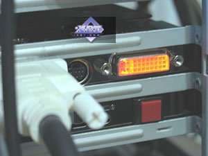 Давайте посмотрим на 3850 с 1 ГБ памяти и уникальной кнопкой на костыле (брэкете), которая не только повышает вольтаж на ядре, но и включает подсветку… в DVI-разъемах. Уж чего-чего, а подсветка в разъемах — это то, чего мы менее всего ожидали, потому Asus даже как-то ошеломил своей «изюминкой». Правда, после недолгих размышлений пришлось признать, что это нововведение мало кому интересно, ибо у всех системные блоки стоят разъемами к стене, и свечение DVI будет не видно. Да и, по сути, всего один разъем будет светиться, ибо второй будет закрыт разъемом от монитора.